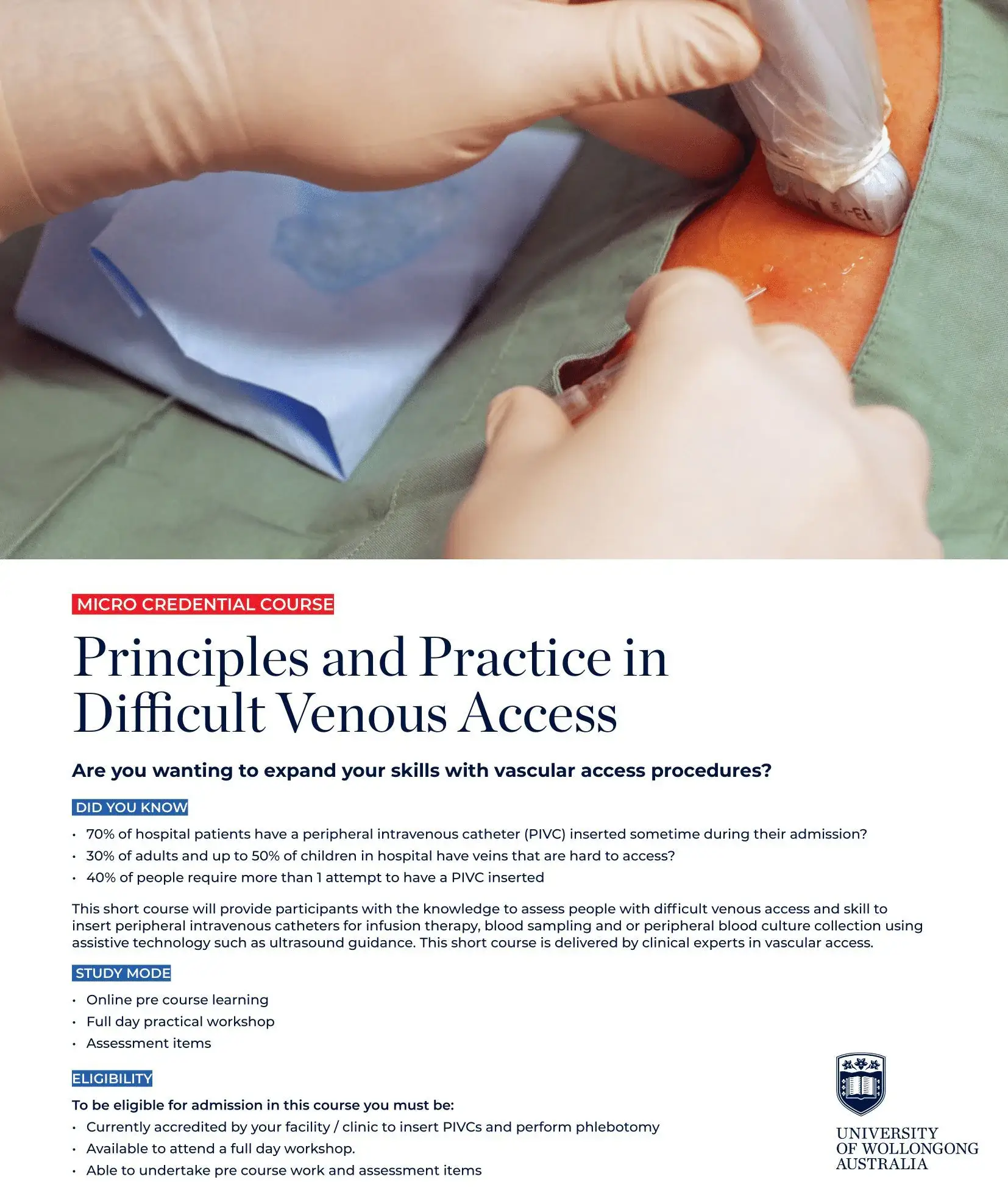 This unit focuses on developing knowledge through access to online material, to enhance competency and skills to insert peripheral VADs and manage most acute and chronic devices. Facilitated simulated workshops and practical application in the workplace with a nominated clinical mentor are also included.